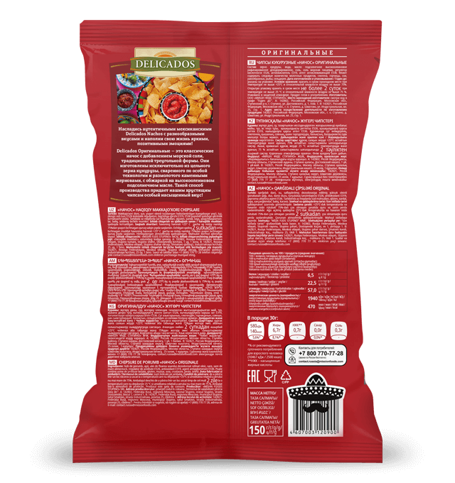 DELICADOS ОРИГИНАЛЬНЫЕ – это классические начос с добавлением морской соли традиционной треугольной формы. Они изготовлены исключительно из цельного зерна кукурузы, сваренного по особой технологии.