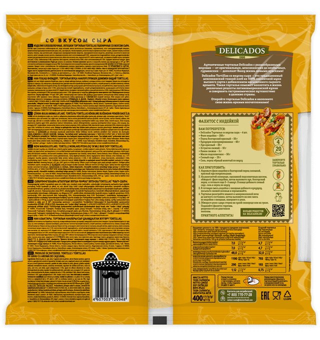 Delicados Tortillas со вкусом сыра - это традиционный мексиканский тонкий хлеб из 100% пшеничной муки высшего сорта с добавлением насыщенного сырного аромата.