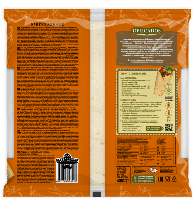 Delicados Tortillas Оригинальные – это традиционный мексиканский тонкий хлеб, приготовленный из 100% пшеничной муки высшего сорта по специальному рецепту.