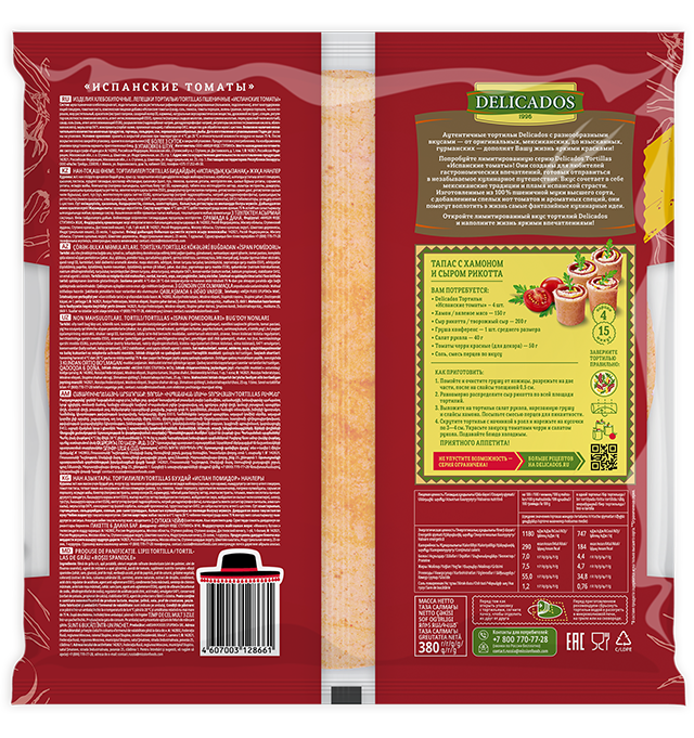 Delicados Tortillas "Испанские томаты" созданы для любителей гастрономических впечатлений. Изготовленные из 100% пшеничной муки высшего сорта, с добавлением спелых нот томатов и ароматных специй, они помогут воплотить в жизнь самые фантазийные кулинарные идеи.