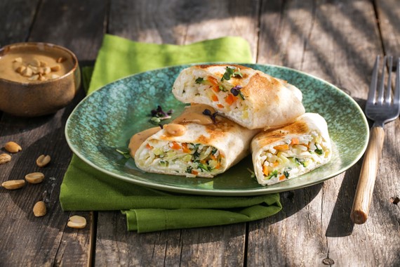 Смажьте готовую лепешку тортилья йогуртом и распределите начинку между лепешками, плотно сверните в роллы. Быстро обжарьте на антипригарной сковороде и подавайте с арахисовым соусом.