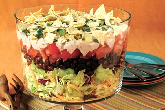 Смешайте соус сальса и сметану до получения однородной массы, залейте овощи равномерно сверху. Посыпьте тертым сыром и зеленым луком. Поставьте в холодильник на несколько часов.