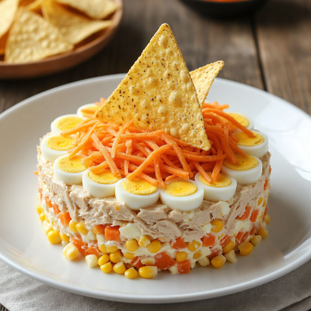 Украсьте салат целыми чипсами начос, поставив их на поверхность вертикально, как парус. Достаточно 3–4 шт. Поставьте блюдо в холодильник пропитаться на пару часов.